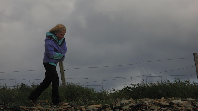 From the moment we boarded the first ferry until this exact second, even as I sit at the kitchen table, watching North Sea waves blow across the bay and crash on the beach, I don't think the wind has ceased to blow since we arrived, not even to catch a quick breath and pick back up again. We walked the dog down the beach last night... and again this morning we went out, scouring for treasure and sea shells... and sometimes we had to grab ahold of those littles because they couldn't make any headway against the wind.
