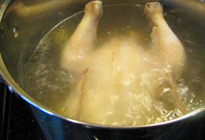 First, he boiled the chicken (and when a friend stopped by with veggies she knew she wouldn't be able to use, including beets and cabbage AND we knew we had all that lovely chicken stock... borscht rapidly bleeped on the menu radar). Once that cooled, he removed the bones and shredded it.